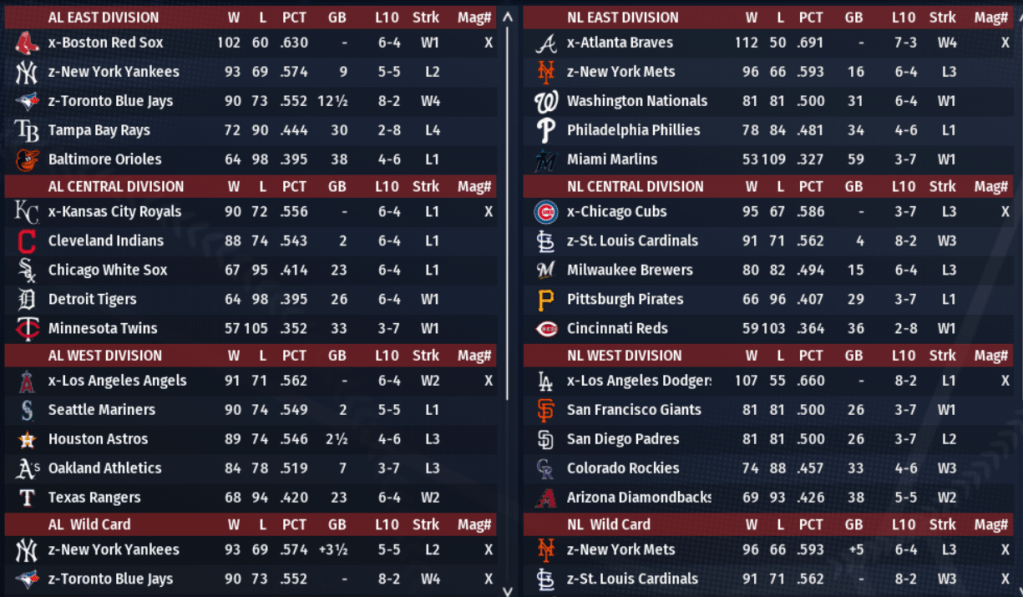 OOTP Baseball Roster Simulation Regular Season Recap wballas no comments June 8, 2021 Here are the final standings in our Out of the Park Baseball Roster Simulation Share this: Click to share on X (Opens in new window) X Click to share on Facebook (Opens in new window) Facebook Like Loading... Related